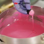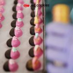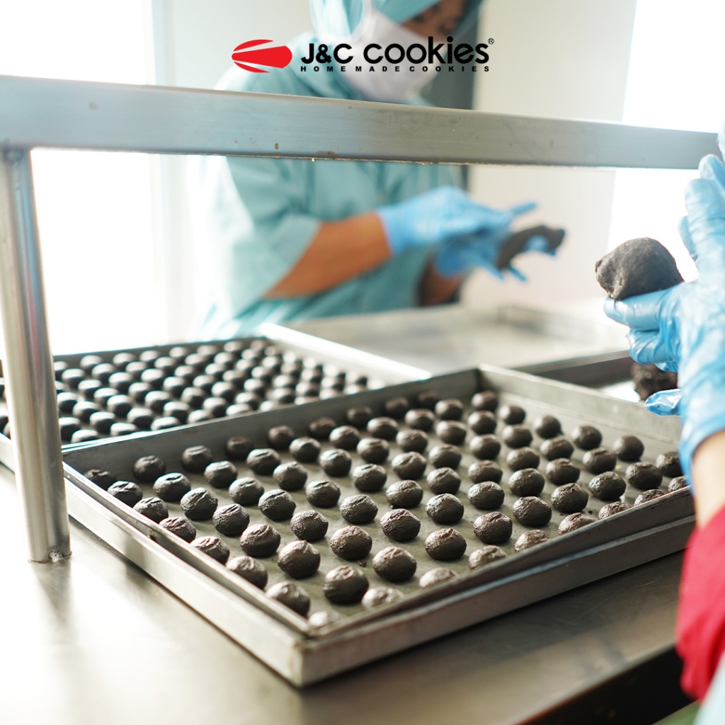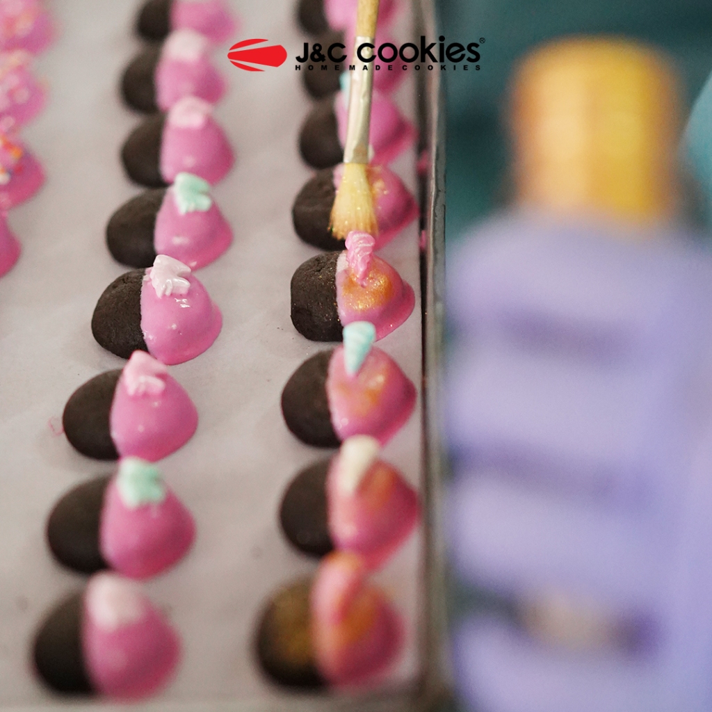 Kue kering coklat dengan campuran cherry dan emping jagung dalam adonan diberi toping coklat strawberry dan taburan permen dengan karakteristik berwarna hitam kecoklatan, beraroma normal (coklat strawberry), rasa normal (manis) dan bertekstur renyah sedikit chewy.